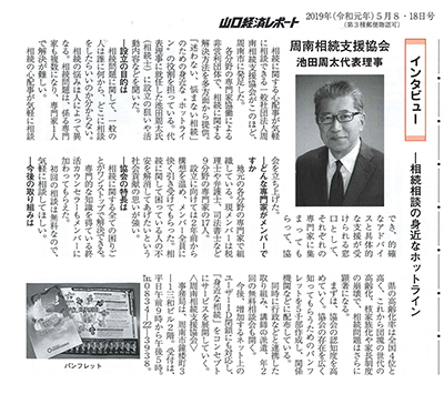 お知らせ イベント案内 活動報告 新聞記事等 第1回 相続基礎講座&無料相談会の様子が日刊新周南に掲載されました PDFファイル 周南相続支援協会設立の記事が山口経済山口経済リポートに掲載されました PDFファイル